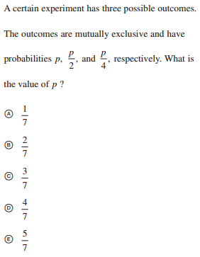 Here, we have a multiple-choice probability question asking for an answer in the form of a fraction. In this question, a certain experiment contains three possible outcomes that are all mutually exclusive. (In other words, all of these outcomes must occur separately.) These three outcomes are p, $p/2$, and $p/4$.